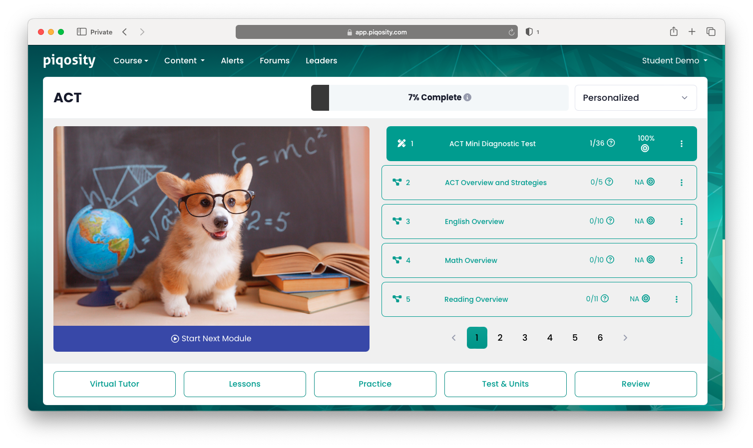 With Piqosity Virtual Tutor 2 (PVT), Piqosity is now “next level” easy to use for individual students. To navigate through an ACT, SAT, or ISEE course, students need only click on the big, blue “Start Next Module” button on their dashboards. A new, color-coded progress bar visually tracks the student’s movement towards reaching their goal score and completing the course. The course is personalized to each student—taking into account their goals, demonstrated capabilities, and timeline.
