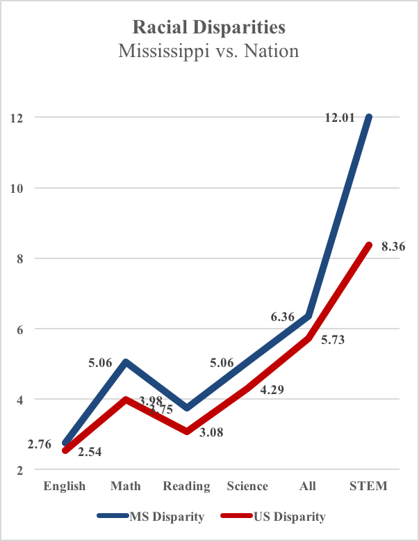 In Mississippi this disparity is more severe. While the gap between whites and blacks is similar to the nation in English, it’s most extreme when examining readiness in STEM fields (science, technology, engineering, and mathematics); here white students are 12 times more likely to be prepared for college than their black counterparts.