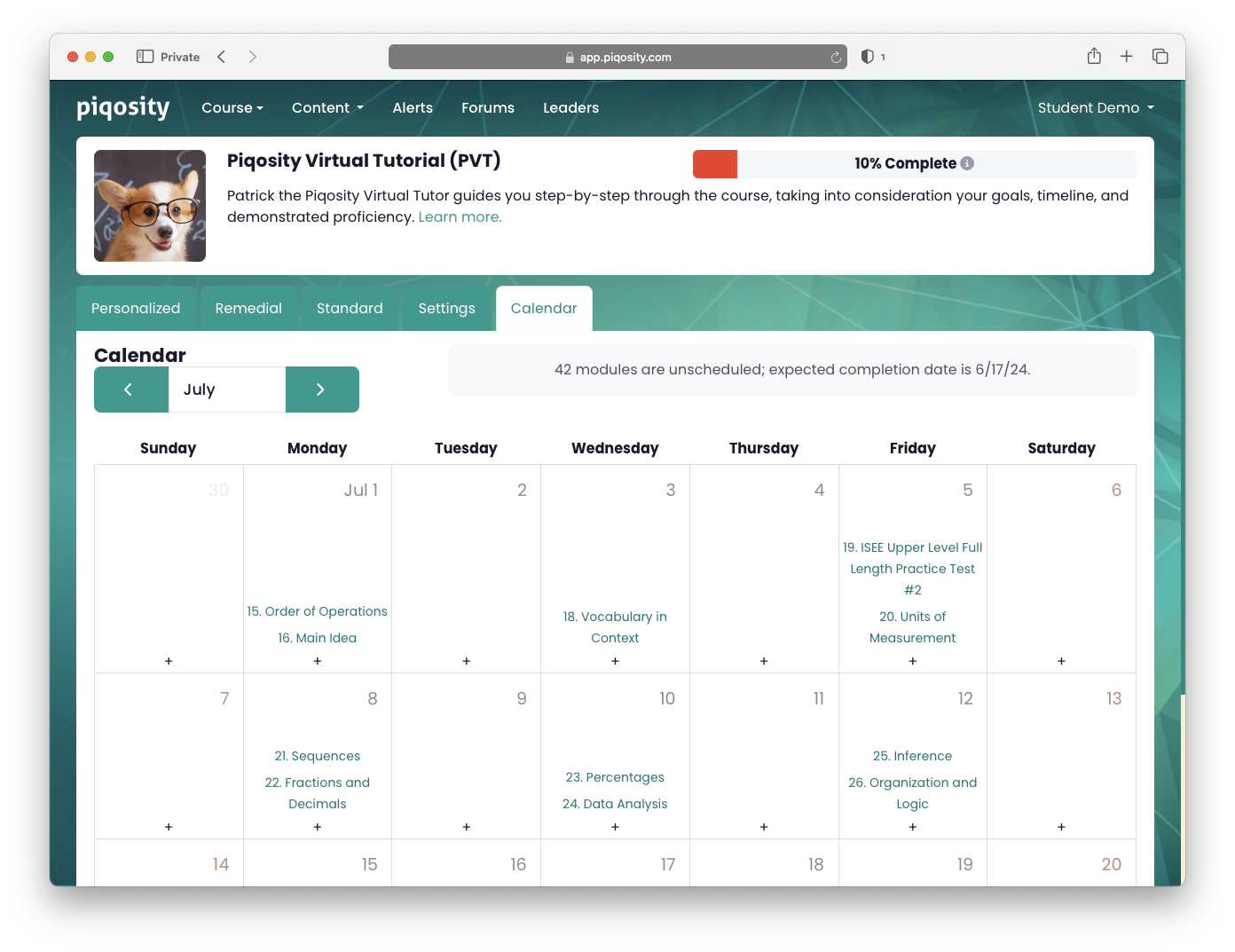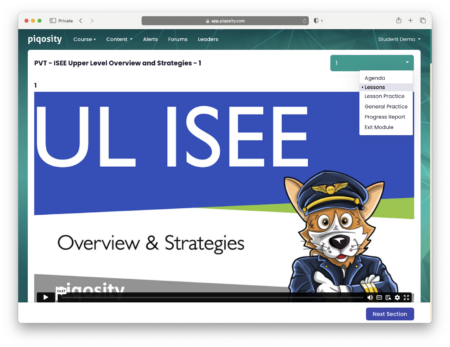 For example, the PVT sequence for the ISEE Upper Level course includes up to 70 modules for students aiming for the highest possible score. Because each of these modules will take an average of 30 minutes to complete (excluding practice tests), if the student works just 2 hours a week, they will require over 18 weeks or more than five months to complete Piqosity’s course.