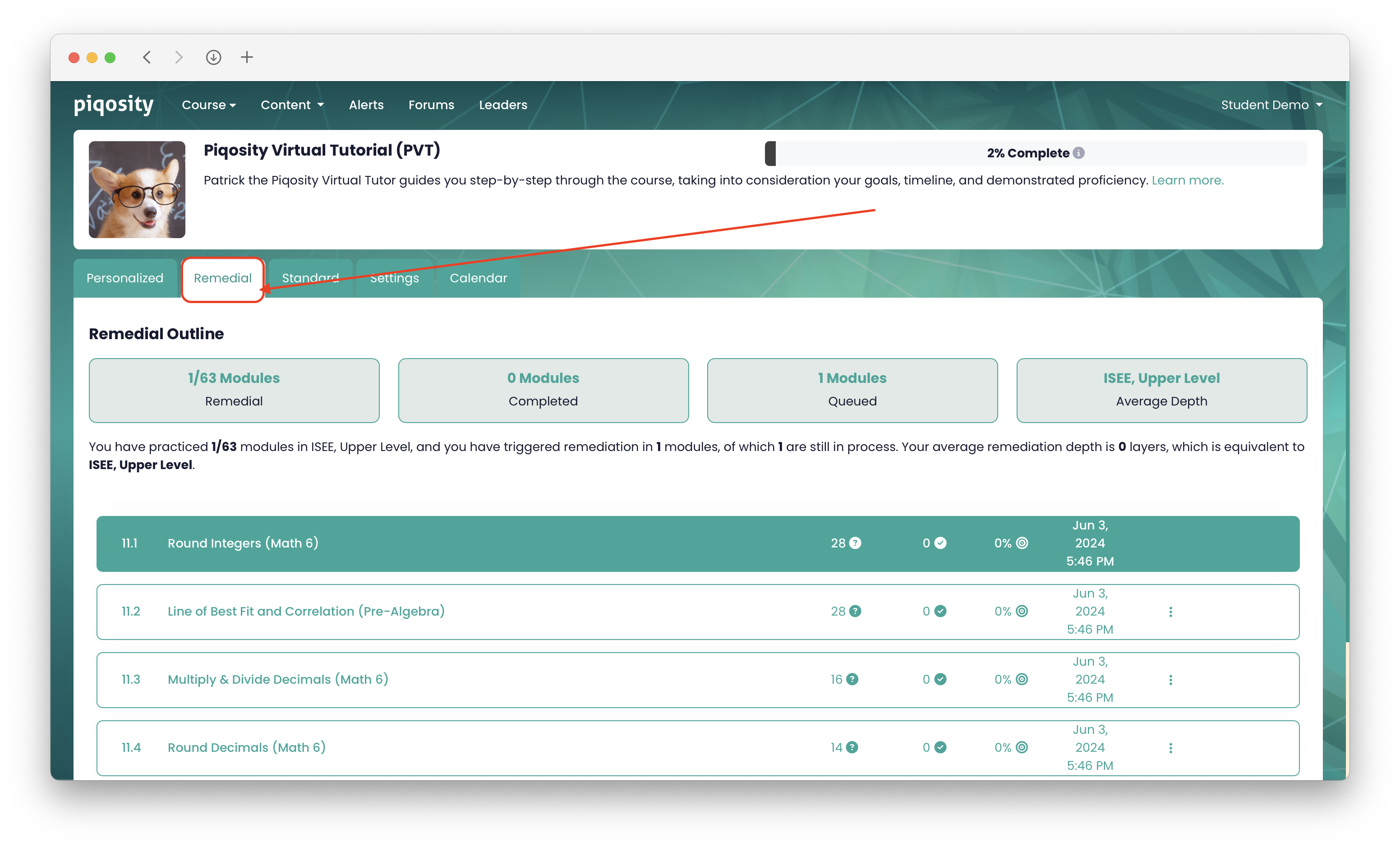 PVT adds remedial math modules to the student’s sequence when they score below a certain accuracy level on a course-specific module. By default students are automatically asked to complete these remedial modules, but they can ignore them until they have time.