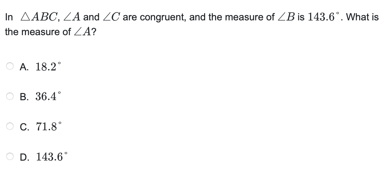 Since all the interior angles of a triangle must add to 180 degrees, angles A, B, and C must add to 180 degrees. Let’s subtract angle B, 143.6 degrees from 180, which results in 36.4 degrees. Since angles A and C are congruent, we can just divide this by 2 in order to get the measure of angle A. If we do this, we’ll find that the measure of angle A is 18.2 degrees, or option A.