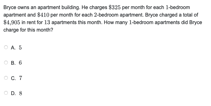 Let’s call the number of 1-bedroom apartments x and the number of 2-bedroom apartments y. If we write out all of given information, we can write two discrete algebraic expressions using these variables. The first deals with the money that Bryce made, and can be written: 325x + 410y = 4,905. The second tells us how many apartments Bryce rented out in total: x + y = 13. In order to answer the question, we should find y in terms of x in the second equation (y = 13 – x) and plug this into our first equation for the y (325x + 410(13 – x) = 4,905). If we solve this, we’re left with x = 5, so option A is correct.