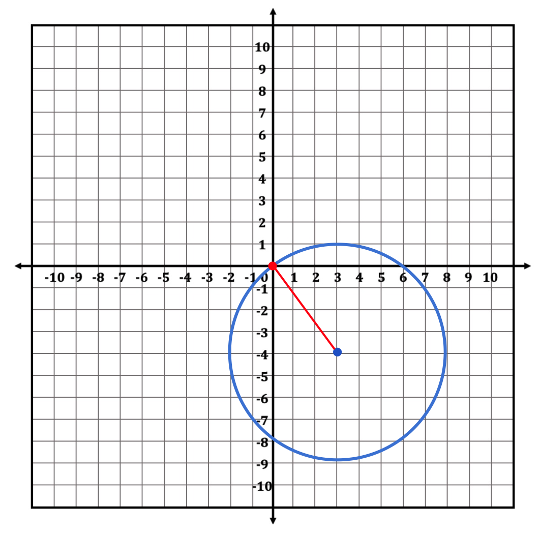 If you just read the question, it might be hard to imagine exactly what’s going on. Drawing it might help you understand the situation a little better. In the drawing, it becomes clear that a line drawn between the two points given to us in the question (the circle’s center and a point on its edge) will be a radius of the circle. In order to find the equation of a circle, we need to know the coordinates of the circle’s center point and the measure of its radius. This means that in order to write the equation, we just need to find the measure for this radius!
