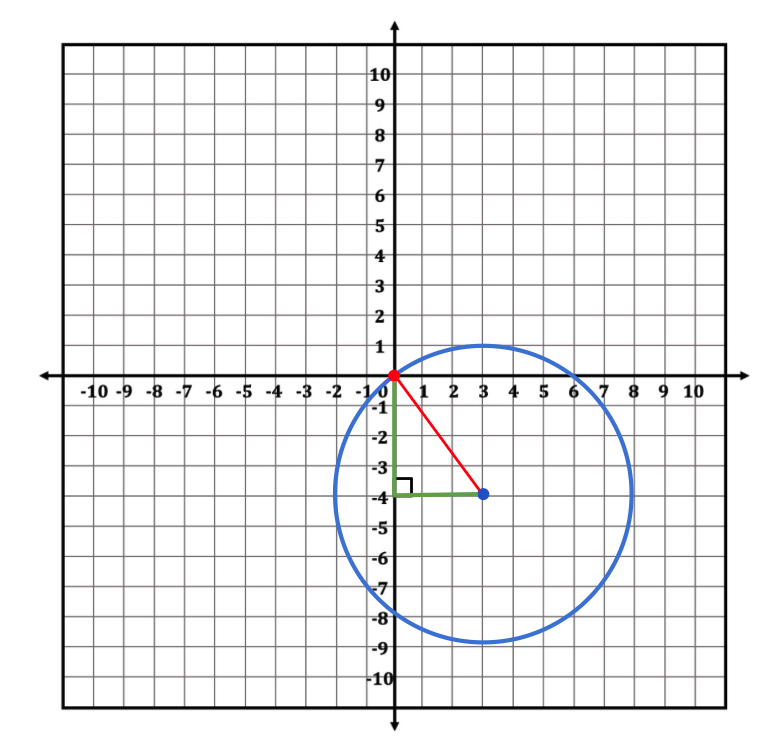 We could use the distance formula to find the measure of the radius, or we could use drawing again to help us figure it out. If we draw two more lines, we can create a right triangle, of which the radius is the hypotenuse. Now we can use Pythagorean Theorem to figure out the radius’s measure (this is essentially what the distance formula does as well!).