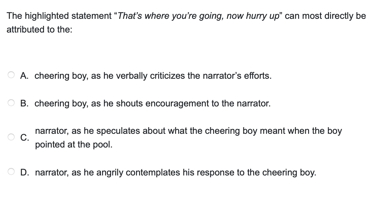 Before looking at the answer choices, let’s go to the passage and see if we can come up with our own answer. This question relates to the highlighted text in the third paragraph. In context, this line is what the narrator imagines that his rival might be thinking when the other boy begins to root for him (notice the preceding text “as if to say,” which is a cue to us that this line is not literally spoken by the other boy). This alone tells us that answer C must be correct, since that’s the only one that properly attributes the line as dialogue imagined by the narrator.